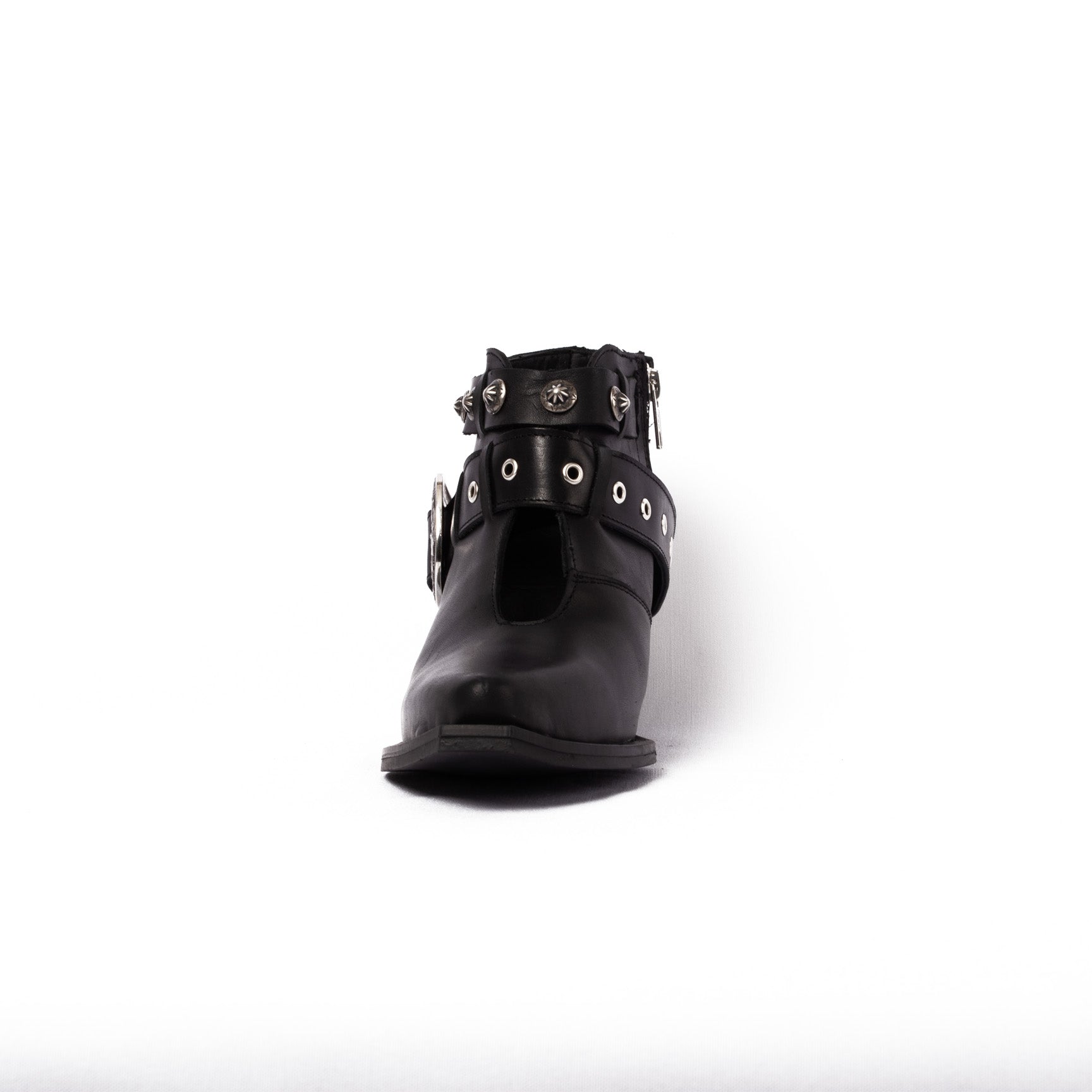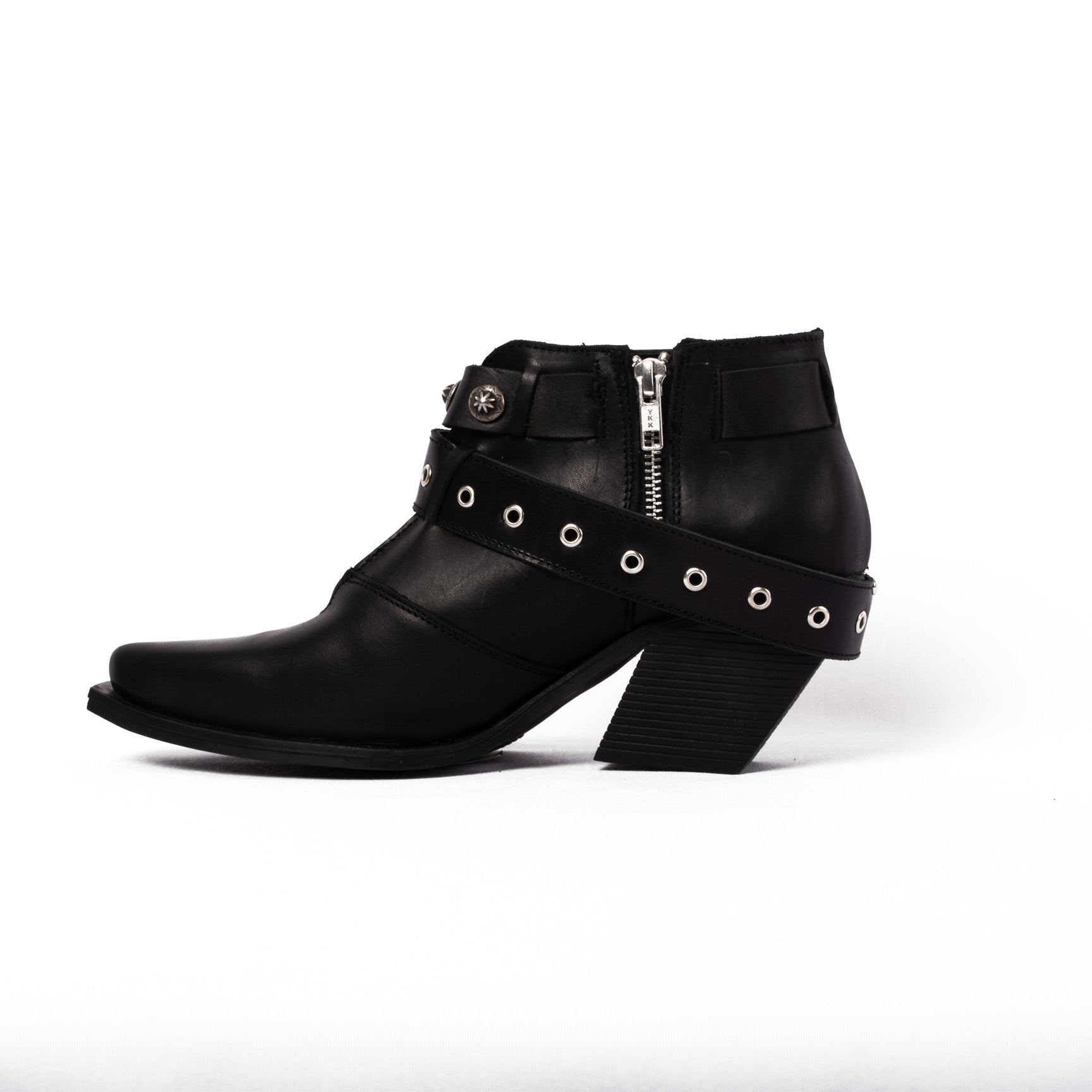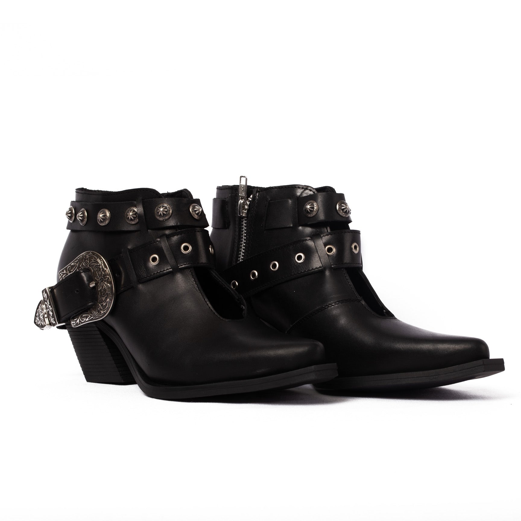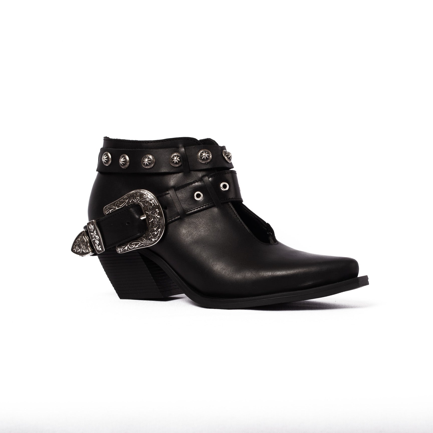 MEDIO BOTIN , HORMA PUNTAL , APLICACIONES EN CINTO , SUELA RUBBER ANTIDESLIZANTE ALTURA TACON 6 CM TIPO CUBANO