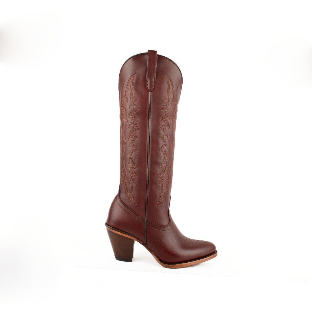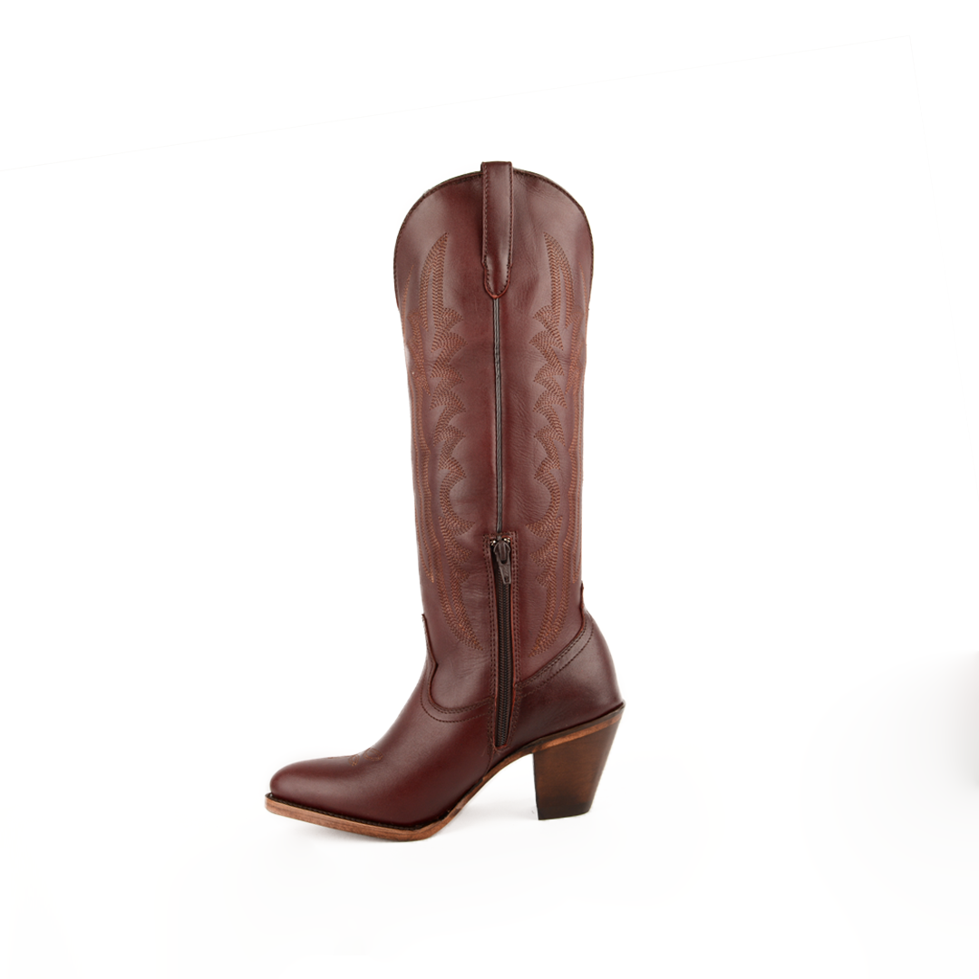 BOTA ALTA DAMA , SUELA CUERO COCIDA Y PEGADA APLICACIONES EN TODO EL TUBO.