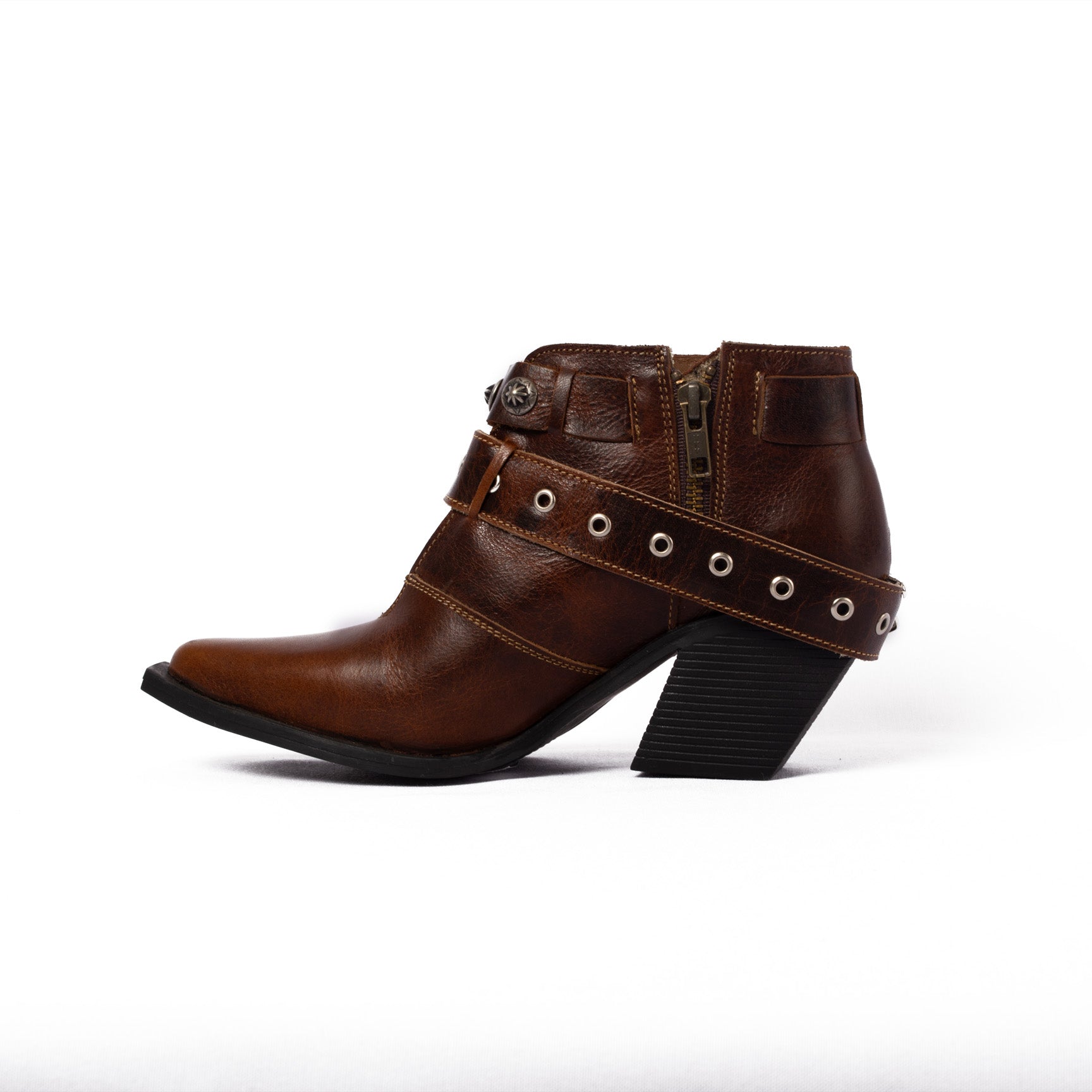 MEDIO BOTIN , HORMA PUNTAL , APLICACIONES EN CINTO , SUELA RUBBER ANTIDESLIZANTE ALTURA TACON 6 CM TIPO CUBANO
